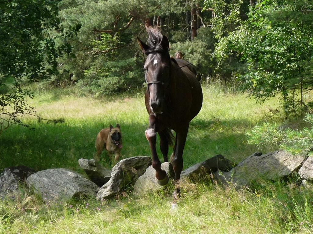 Arwen skáče přes kameny, které jsme potkali na vyjížďce