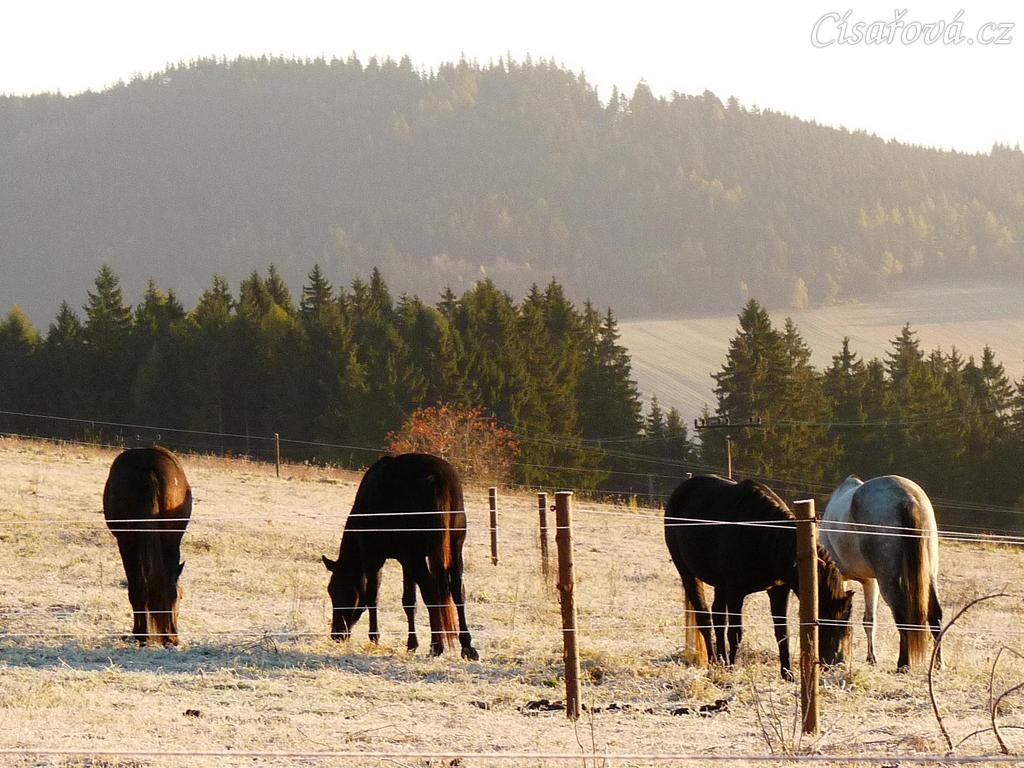 Konec října, východ slunce, ojíněná tráva v zimním výběhu
