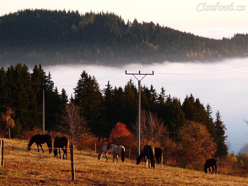 Ranní slunce, koně v zimním výběhu a jejich výhled do krajiny v mlze