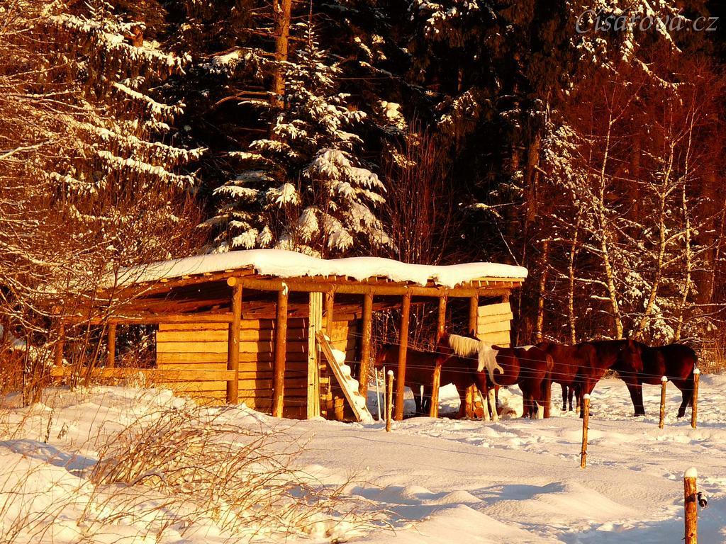 Koně odpočívají u přístřešku při východu slunce