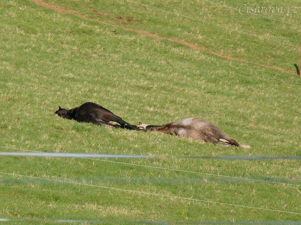 2.5.2011 - Hřebci spí na pastvině, čtyřletí Rybíz a Dukát, hluboký spánek:-)