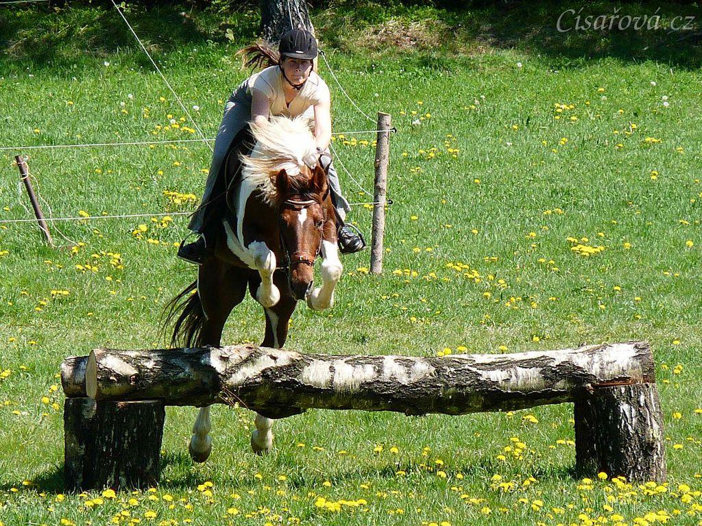 Vikina skáče přes březový oxer na našich pastvinách