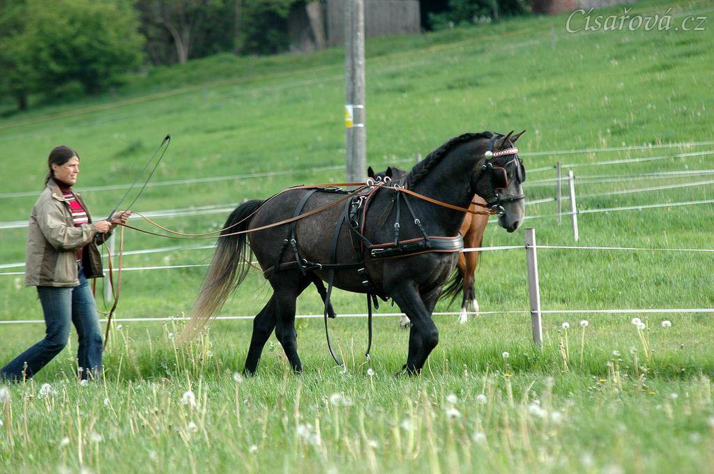 Rybíz se učí tahat - řízení opratěmi po jízdárně. Olga a Věra Procházková