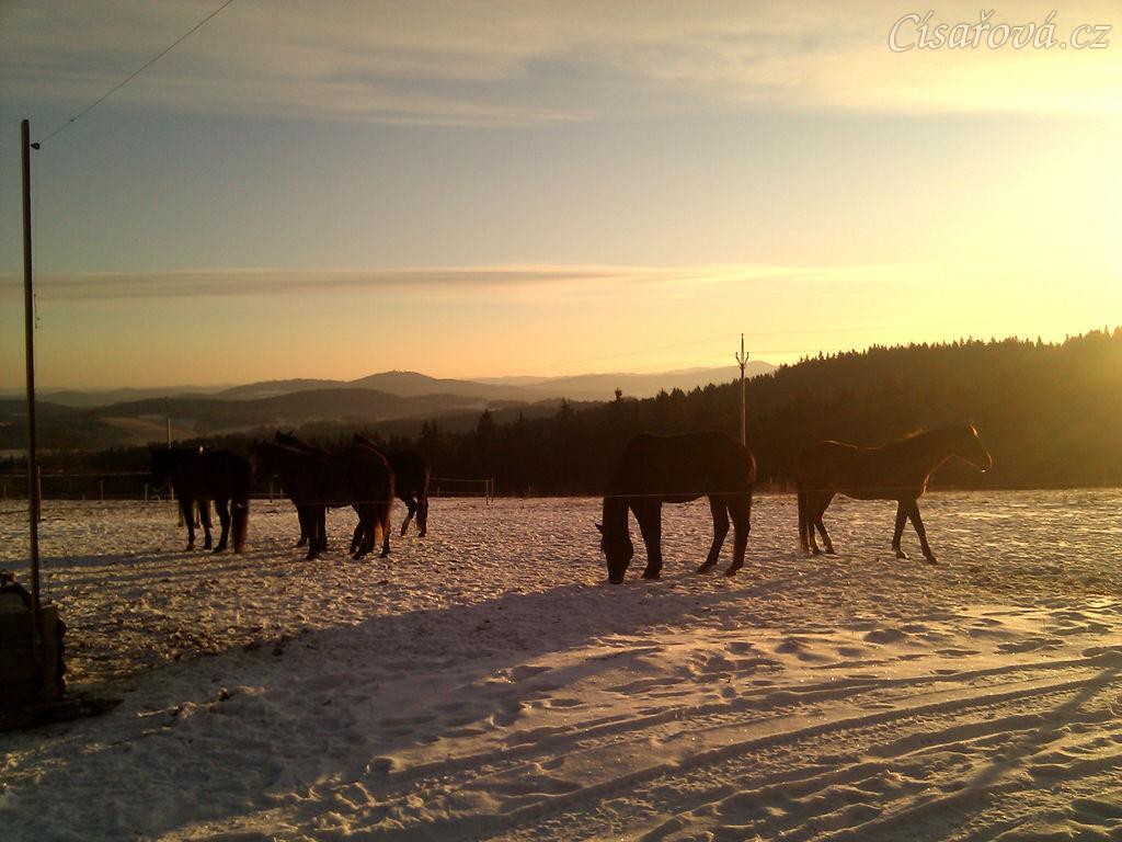 Stádo klisen při východu slunce