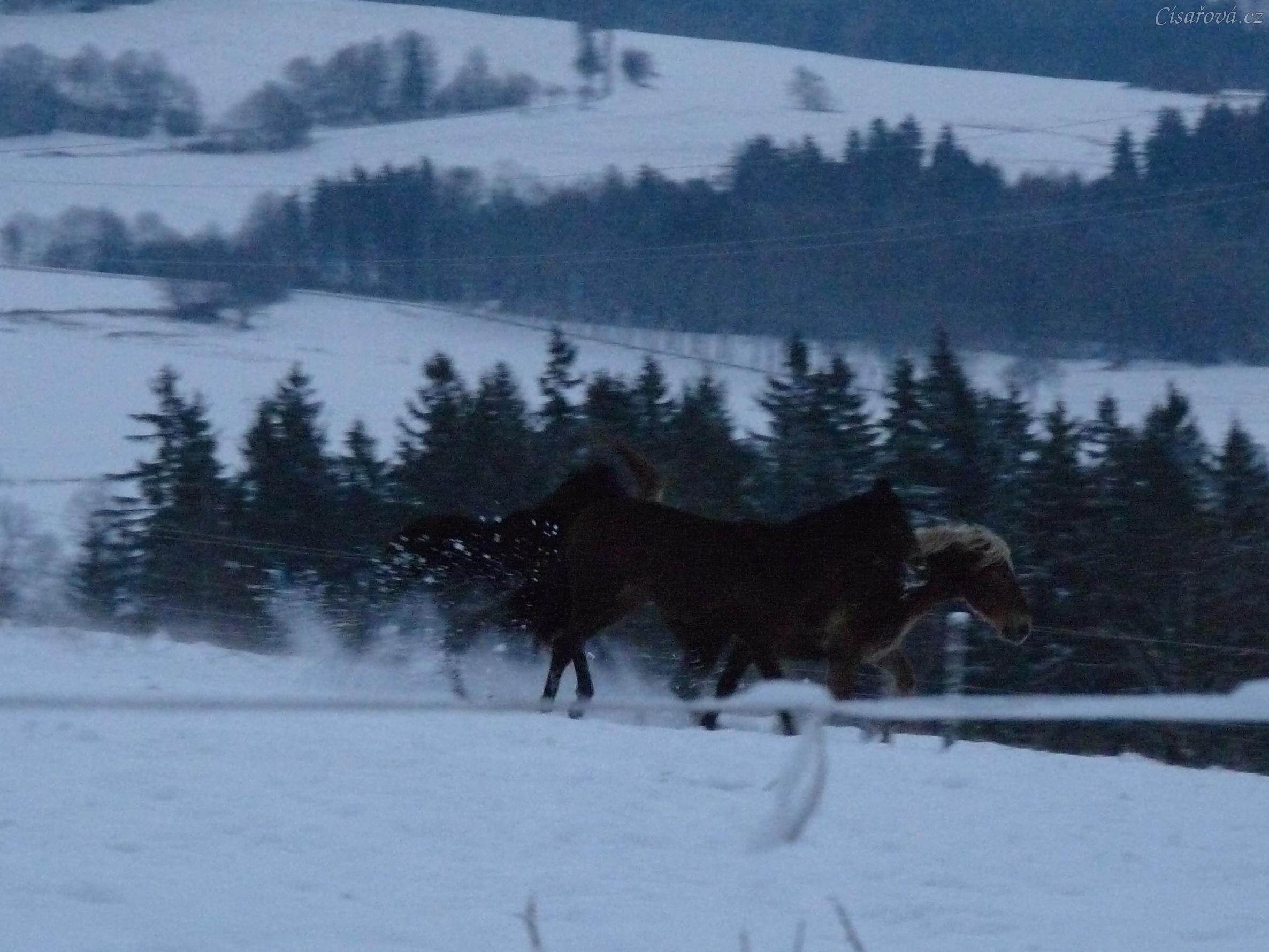 Mladí hřebci dovádí při svítání. (Kvalita fotek je horší, bylo hodně málo světla, teprve svítalo...)