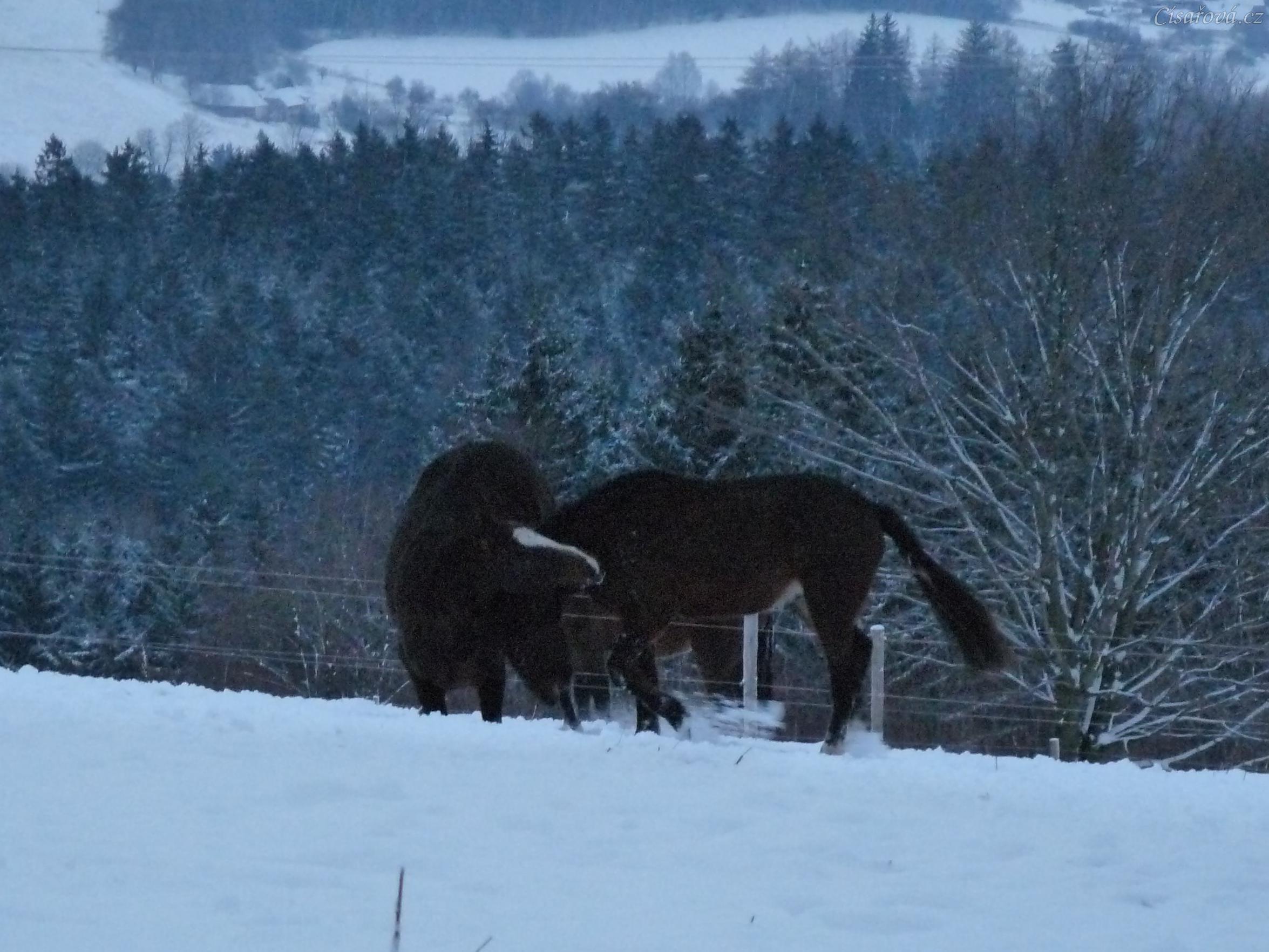 Koně dovádějí při svítání, roční Gimli a Zephyr. (Kvalita fotek je horší, bylo hodně málo světla, teprve svítalo...)