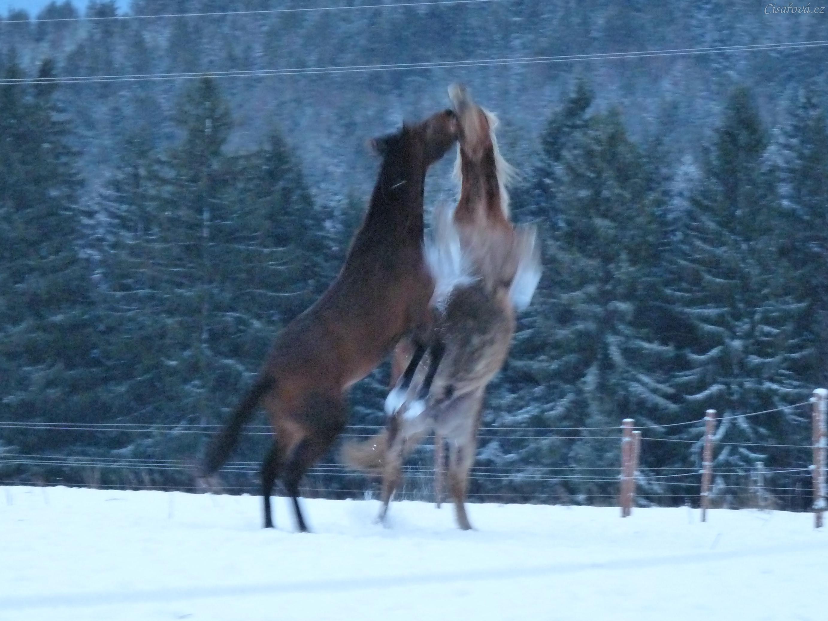 Koně dovádějí při svítání, dvouletý norik Cherokee a roční hannover Ramon. (Kvalita fotek je horší, bylo hodně málo světla, teprve svítalo...)