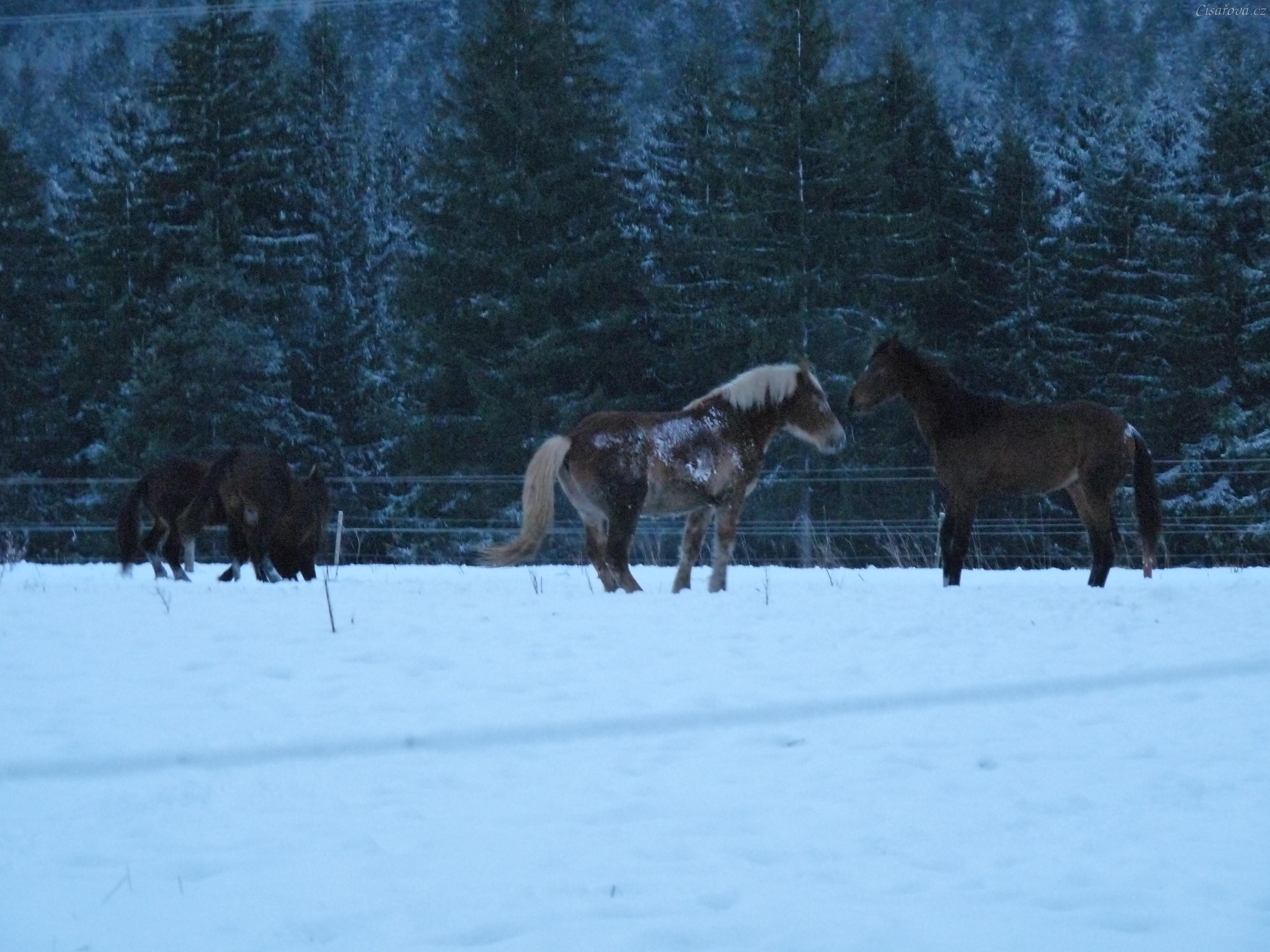 Mladí hřebci dovádí při svítání. (Kvalita fotek je horší, bylo hodně málo světla, teprve svítalo...)