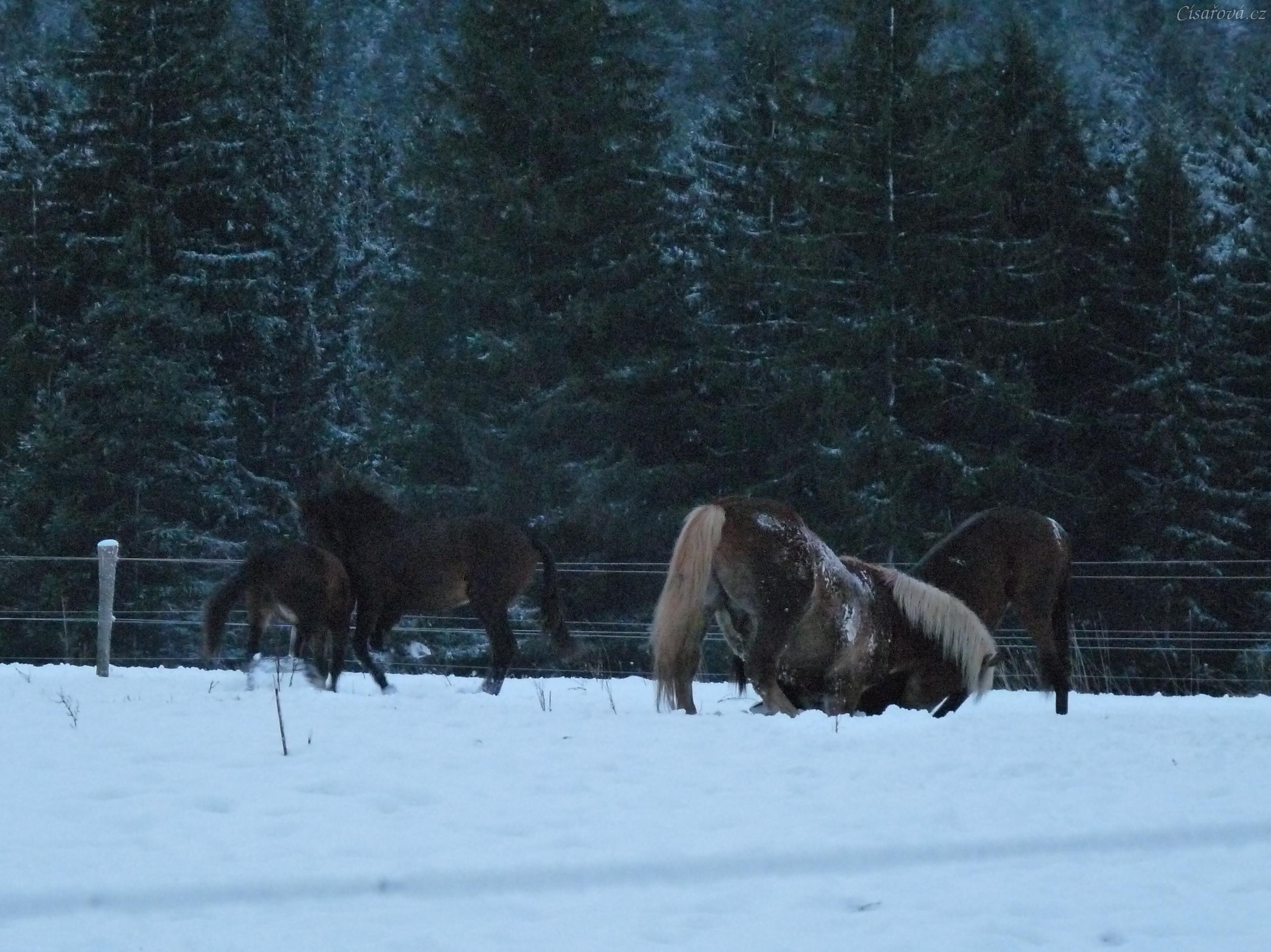 Mladí hřebci dovádí při svítání. (Kvalita fotek je horší, bylo hodně málo světla, teprve svítalo...)