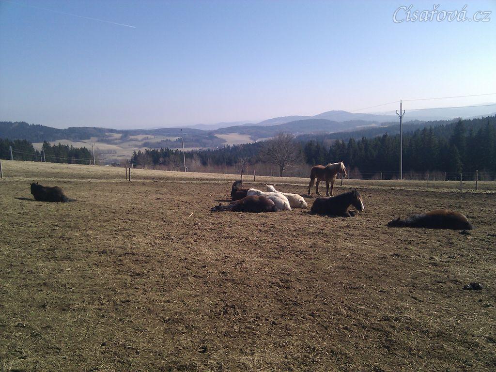 Ranní siesta hřebců, téměř všichni hřebci spí, tradičně "na jedné hromadě" :-)