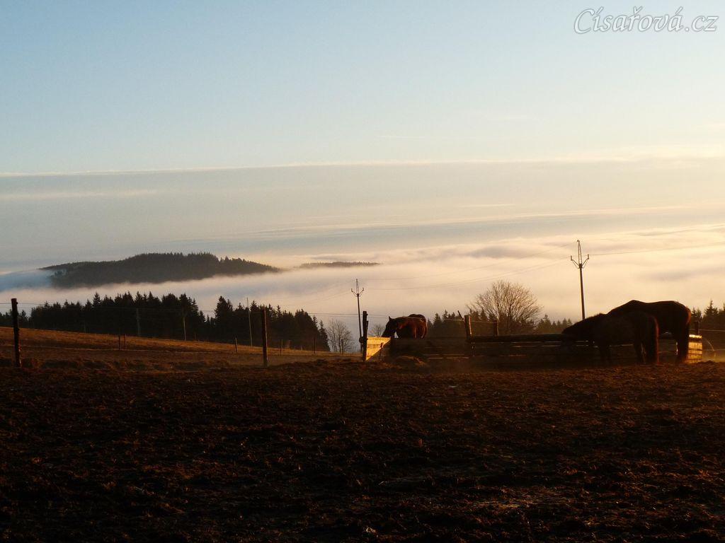 Konečně začíná jaro, brzké ráno, koně u senáže