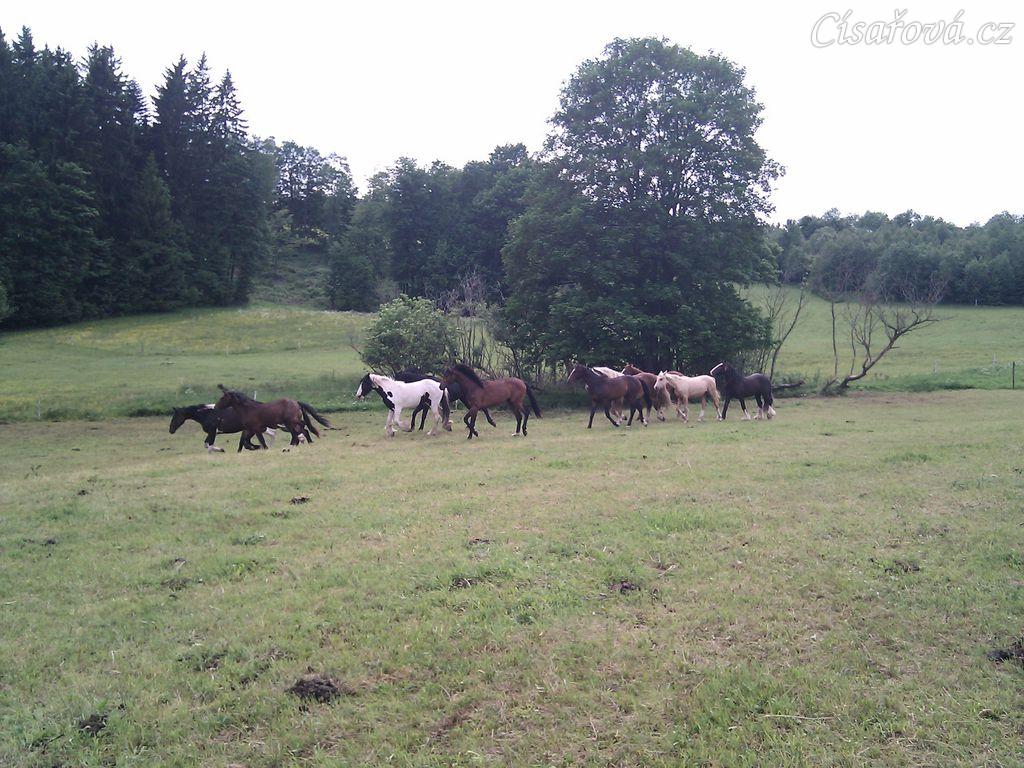 Stádo hřebců dovádí při příchodu nového člena stáda