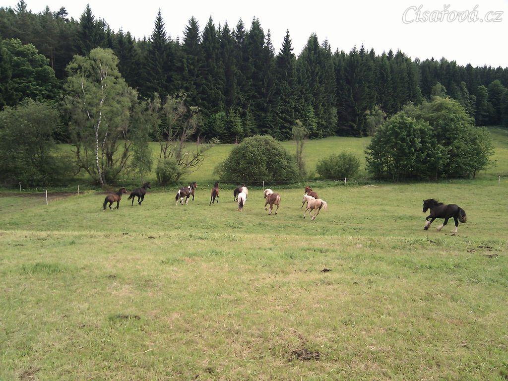 Stádo hřebců dovádí při příchodu nového člena stáda
