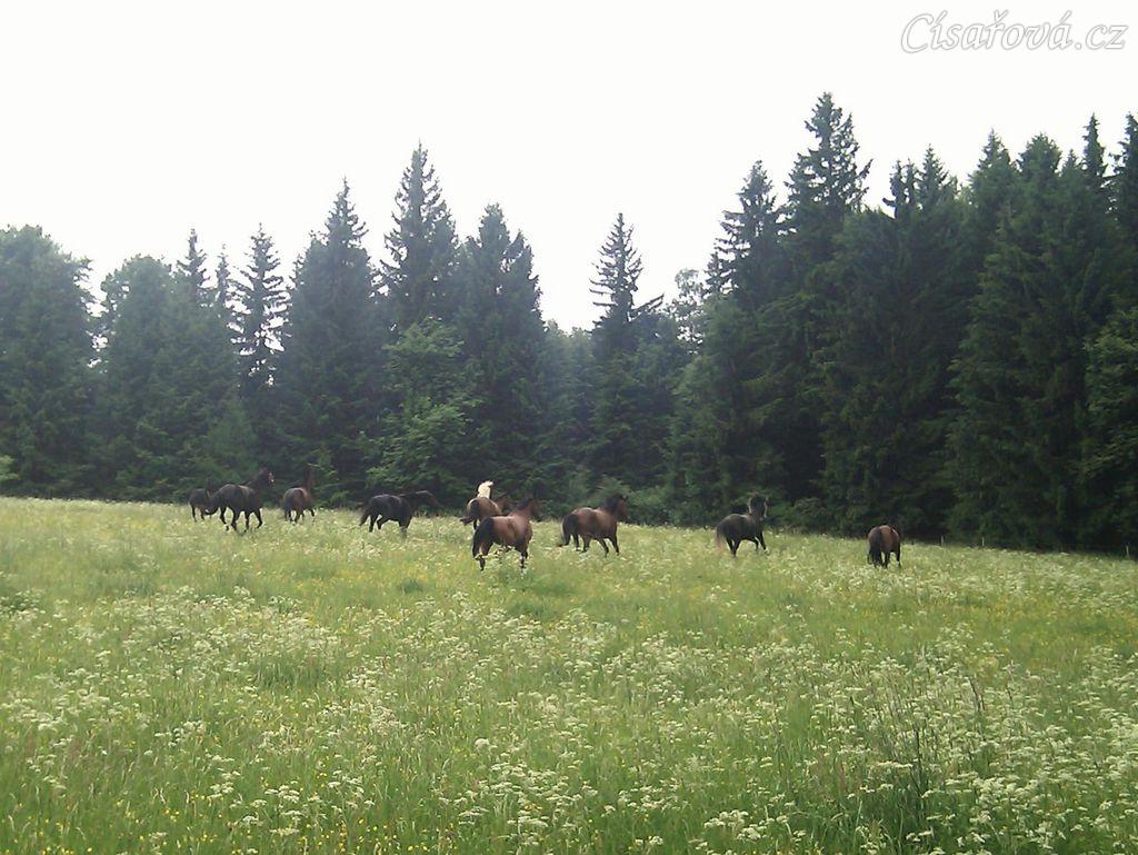Stádo klisen dovádí při vypuštění na novou pastvinu