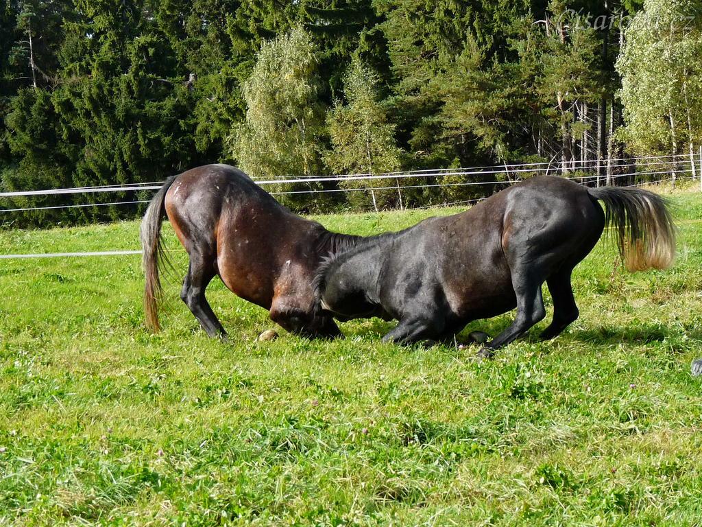 Září 2010, tříletí hřebci Monty a Rybíz si hrají