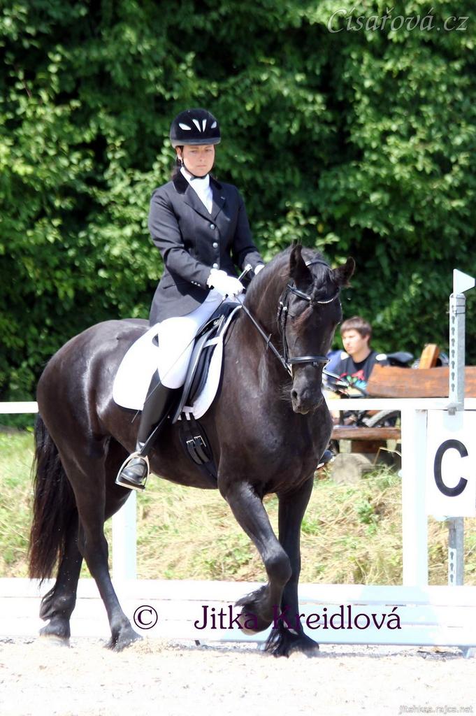 Gvennie Goodshapes, čtyřletá fríská klisna se svou majitelkou na jejich prvních drezurních hobby závodech, Hunčice 26.7.2014. Foto Jitka Kreidlová