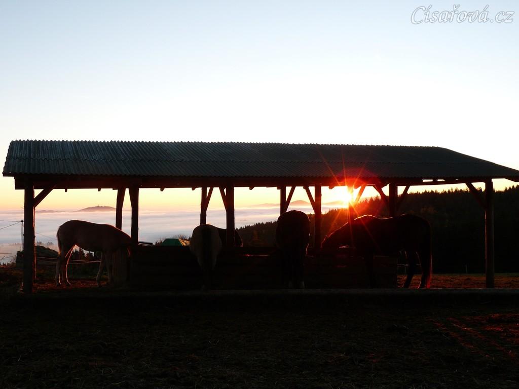 Mlhavá podzimní rána, stádo klisen u seníku