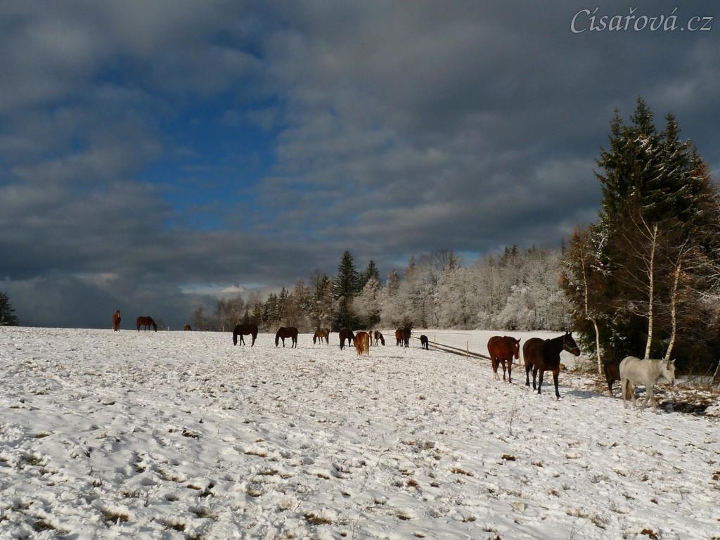 Stádo hřebců čeká na převedení do zimního výběhu