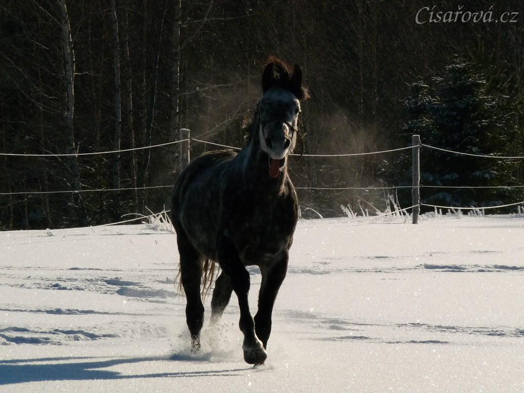 Čtyřletý nedávno vykastrovaný hřebec si užívá sněhu