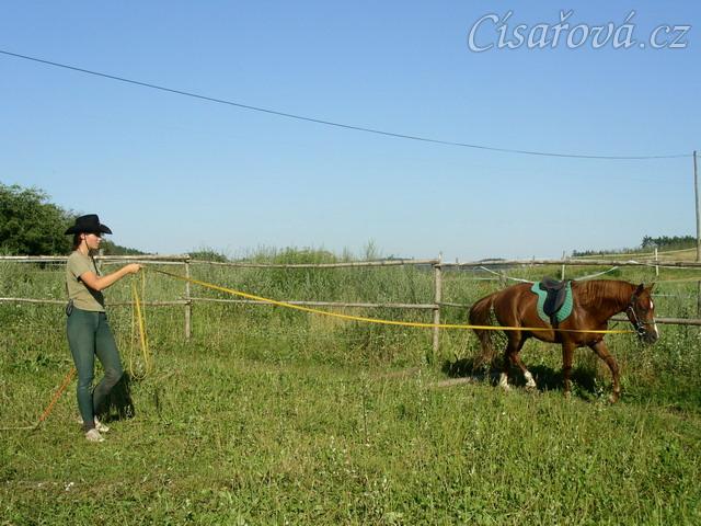 Janek na lonži se chambonem, už po týdnu lonžování chodí s hlavou dole a aktivně vykračuje od zádě.