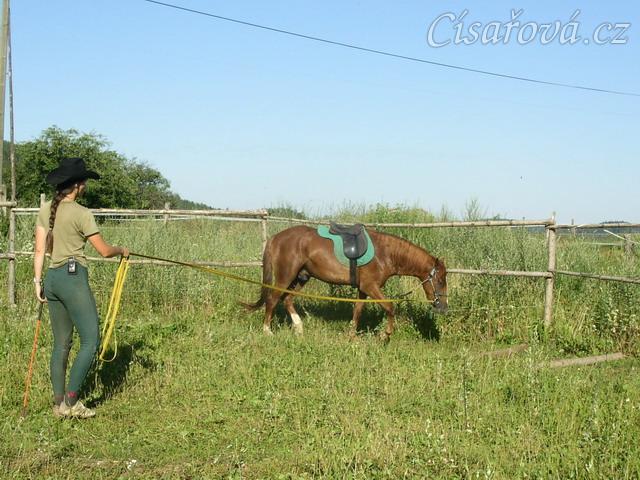 Janek na lonži se chambonem, kouká na kavalety, přes které bude překlusávat.