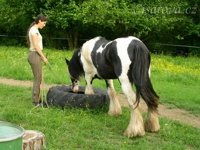 7 her podle Pata Parelli - Bas se poprvé učí stoupnout do pneumatiky, jedna noha je uvnitř